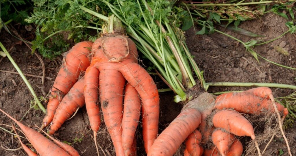 Často sa stáva, že mrkva rastú deformované a zvraty alebo rozdeľujú sa na dve alebo dokonca tri vetvy. Môže mať tiež skreslenie vo forme zahustených výčnelkov na koreňoch.